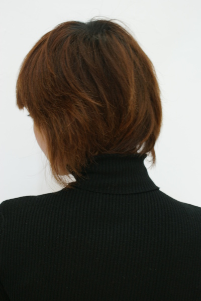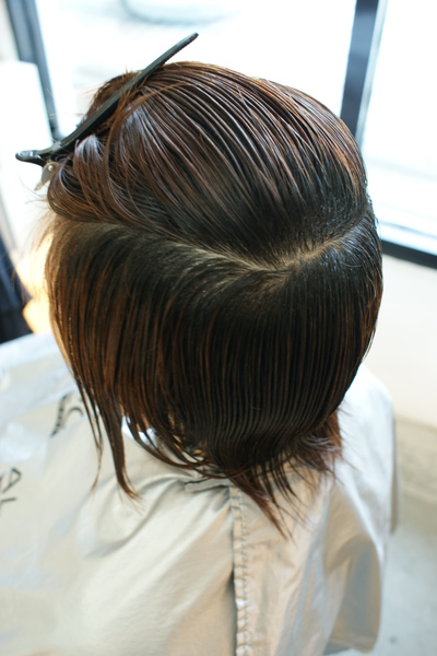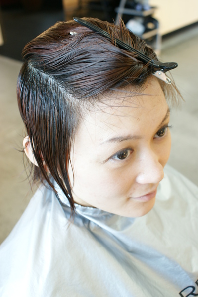 我們裁剪的方式將髮片向上提拉45度角,主要是讓下擺的髮長能有所保留,以免剪去本身原有的長度。