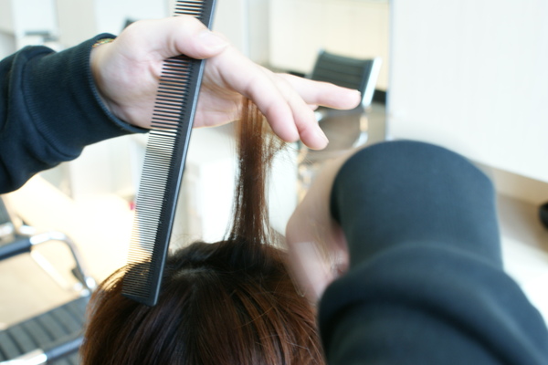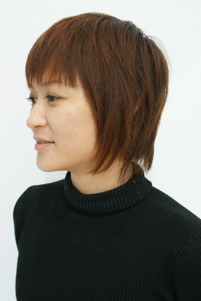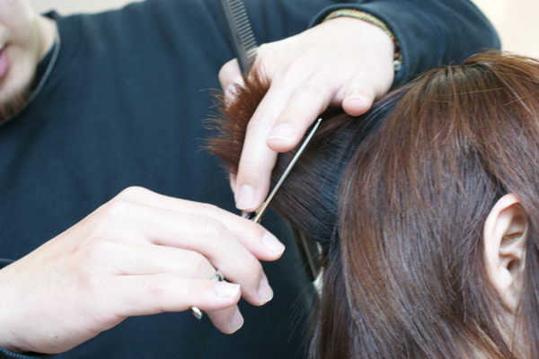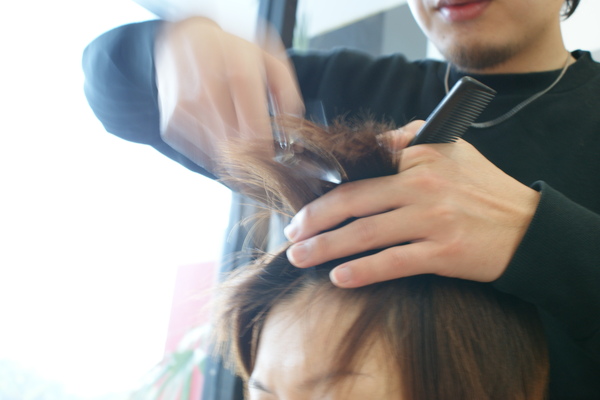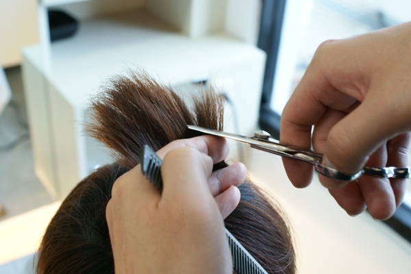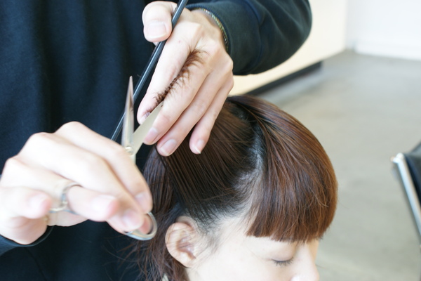 在乾髮上使用剪刀利用深點剪、括剪、挑剪、滑剪的方式,讓原本生硬感的髮型,呈現更加自然柔和。