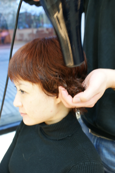 完成長度與層次的設定後,使用吹風機順著自然的髮流由頭頂向下吹乾。